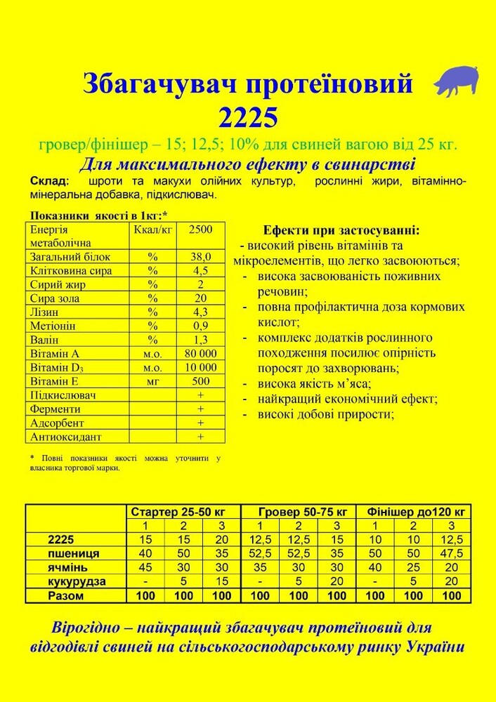 Склад: шроти та макухи олійних культур, рослинні жири, вітамінно-мінеральна добавка, підкислювач.