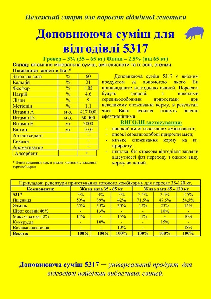 Доповнююча суміш 5317 є якісним продуктом за допомогою якого Ви пришвидшите відгодівлю свиней. Поросята будуть здорові, з високими середньодобовими приростами при невеликому споживанні корму, в результаті чого Ваші зусилля стануть значно ефективнішими.