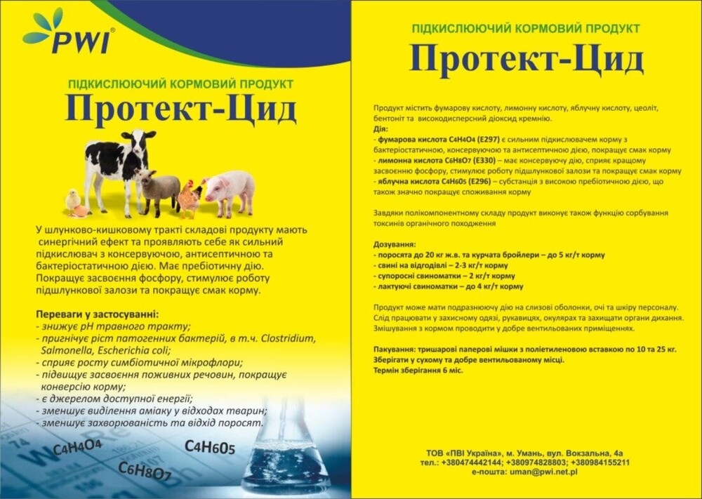 Продукт містить фумарову кислоту, лимонну кислоту, яблучну кислоту, цеоліт, бентоніт та високодисперсний діоксид кремнію.